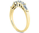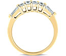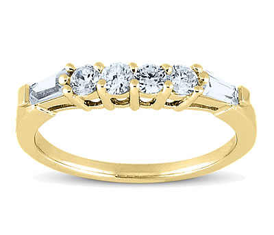 This beautifully styled 18k yellow gold diamond wedding ring is set with 4 brilliant round diamonds and 2 tapered baguette diamonds.